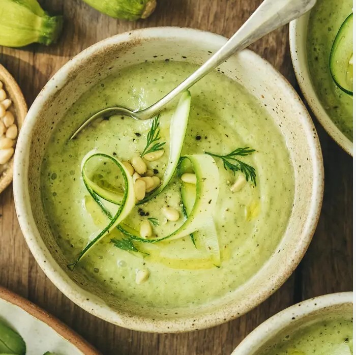 • Soupe froide à la courgette et crevettes grises