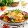 • Dos de cabillaud, tartare de poivrons confits et sa purée à la truffe d’été